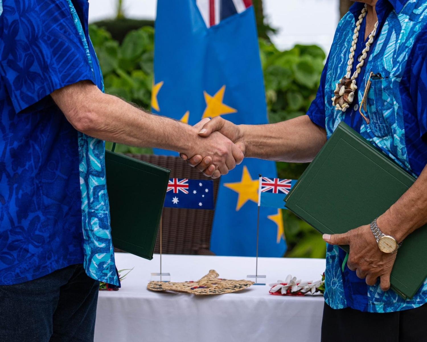 Australia’s Prime Minister Anthony Albanese shakes hands with Tuvalu’s Prime Minister Kausea Natano after signing the “Falepili Union” on 10 November, 2023 (AlboMP/X)